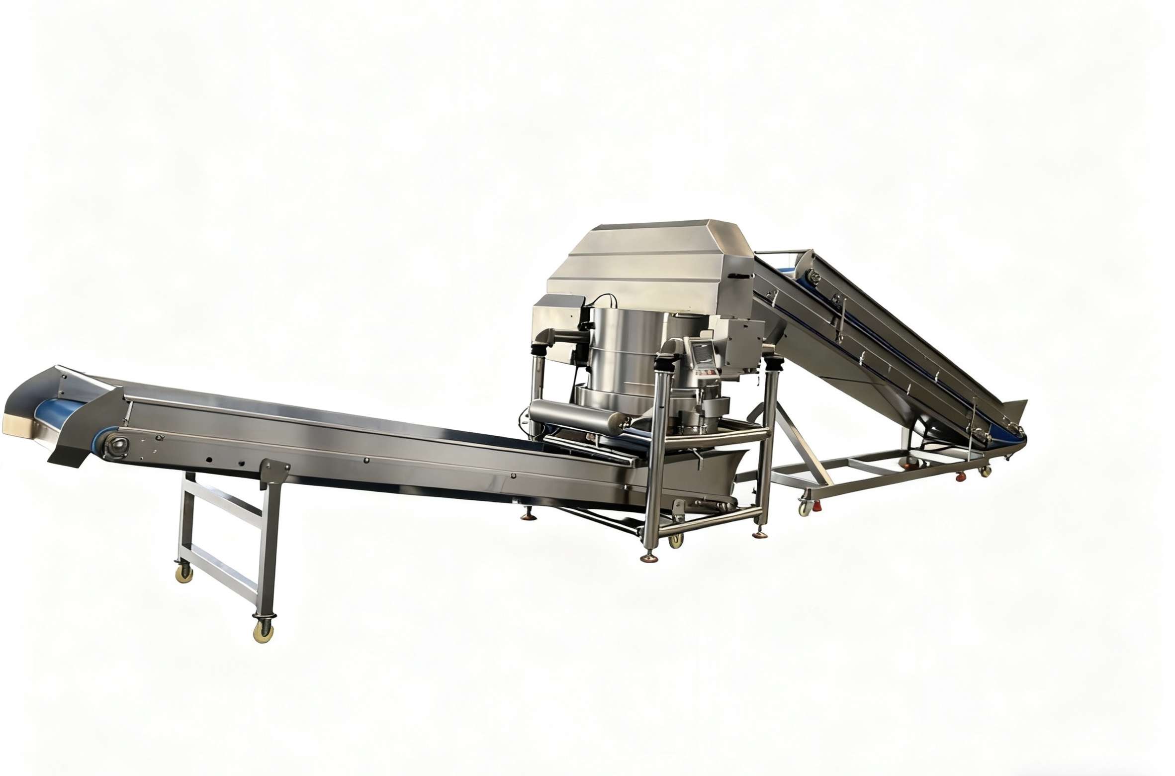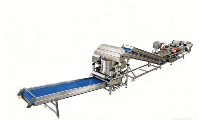 Система складається з приймального (буферного) конвеєра, центрифуги для сушіння та відвідного конвеєра. Обладнання може функціонувати як окрема одиниця або як частина комплексної лінії миття та підготовки продуктів.