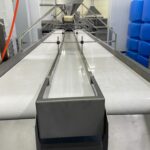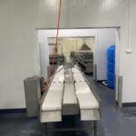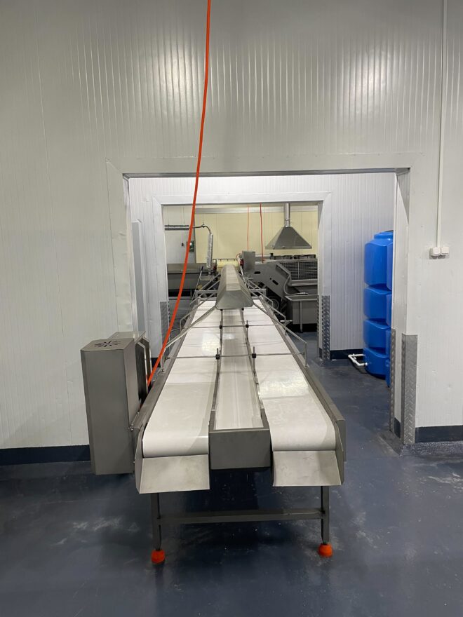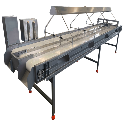 Продукт після етапу обробки подається на конвеєрну стрічку інспекційного столу. Під час руху по стрічці сировина проходить візуальний контроль інспекторів із подальшим відбракуванням неякісної продукції, яка спрямовується окремою лінією в тару для браку. Для якісного огляду над стрічкою по всій довжині столу встановлено світлодіодне підсвічування. Проінспектований продукт через жолоб вивантаження подається в тару для готової продукції або на наступний етап технологічного процесу.