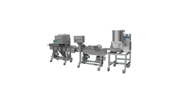 допомогою машин в лінії можна автоматично формувати м’ясні котлети для гамбургерів, обробляти