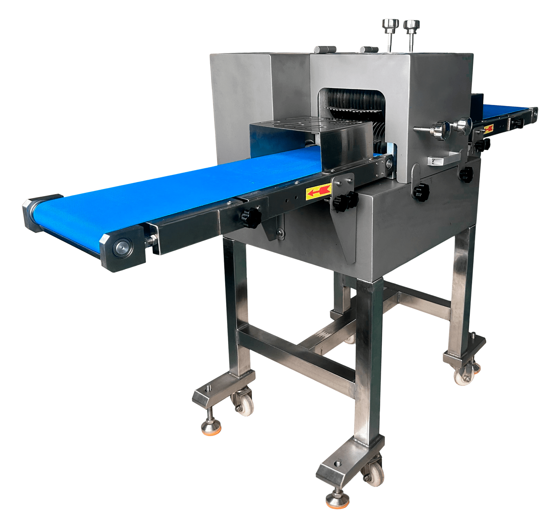Продукт укладається оператором на стрічку подавального конвеєра, яка спрямовує сировину в зону різання. Процес відбувається у два етапи за один прохід: спочатку сировина потрапляє під дію горизонтально розташованих блоків ножів, які пластують продукт за товщиною, після чого вона одразу проходить крізь вертикальні блоки ножів для остаточного формування стріпсів. Каскадна конструкція транспортерів, де подавальна стрічка розташована вище відвідної, забезпечує м’який перехід нарізаного продукту без його деформації чи злипання. Спеціальні скидальні решітки в кожному ножовому блоці примусово знімають шматочки з лез, запобігаючи їх налипанню та гарантуючи безперервність циклу.