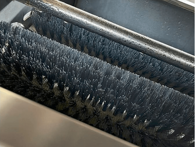 Яйця завантажуються у ванну з водою та за допомогою транспортерної системи подаються в закриту мийну камеру. Усередині машини встановлені спеціальні щітки, які делікатно очищують поверхню яєць від забруднень. Після миття продукт поштучно надходить у зону спектрального скринінгу, де оператор здійснює візуальний контроль і може оперативно вилучити яйця з дефектами. Далі відмиті та перевірені яйця переміщуються на наступний етап технологічної лінії – сушіння, фасування чи інше обладнання для подальшої обробки.
