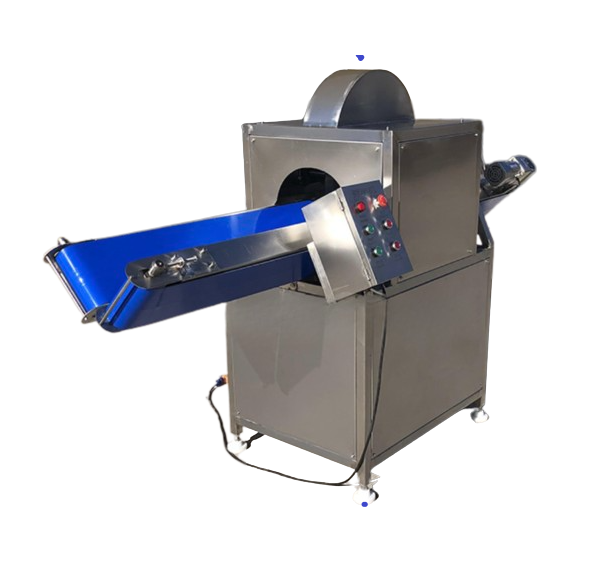 Продукт укладається оператором на V – подібний елеватор подачі, що складається з двох транспортерних стрічок з регулюванням швидкості, розташованих під кутом один до одного, завдяки чому відбувається позиціонування продукту перед нарізкою. Далі продукт надходить у зону нарізки, де потрапляє під вертикально розташований ніж – диск, який без відходів розрізає продукт на дві практично рівні частини, після чого продукт подається в зону вивантаження. Оскільки вертикальний ніж знаходиться в одному положенні і обертається з високою швидкістю, поверхня розрізаного продукту гладка та рівна, а нарізані продукти практично не пошкоджуються, зберігаючи форму та свіжість (у кожному конкретному випадку залежить від виду та якості продукту).