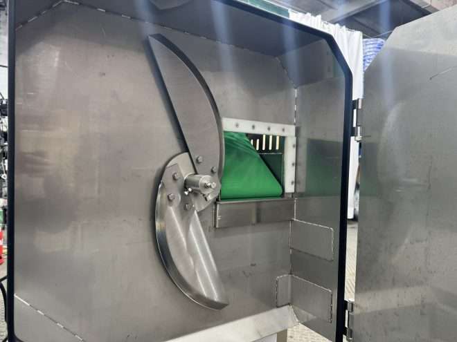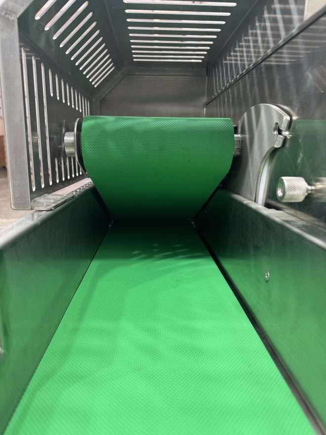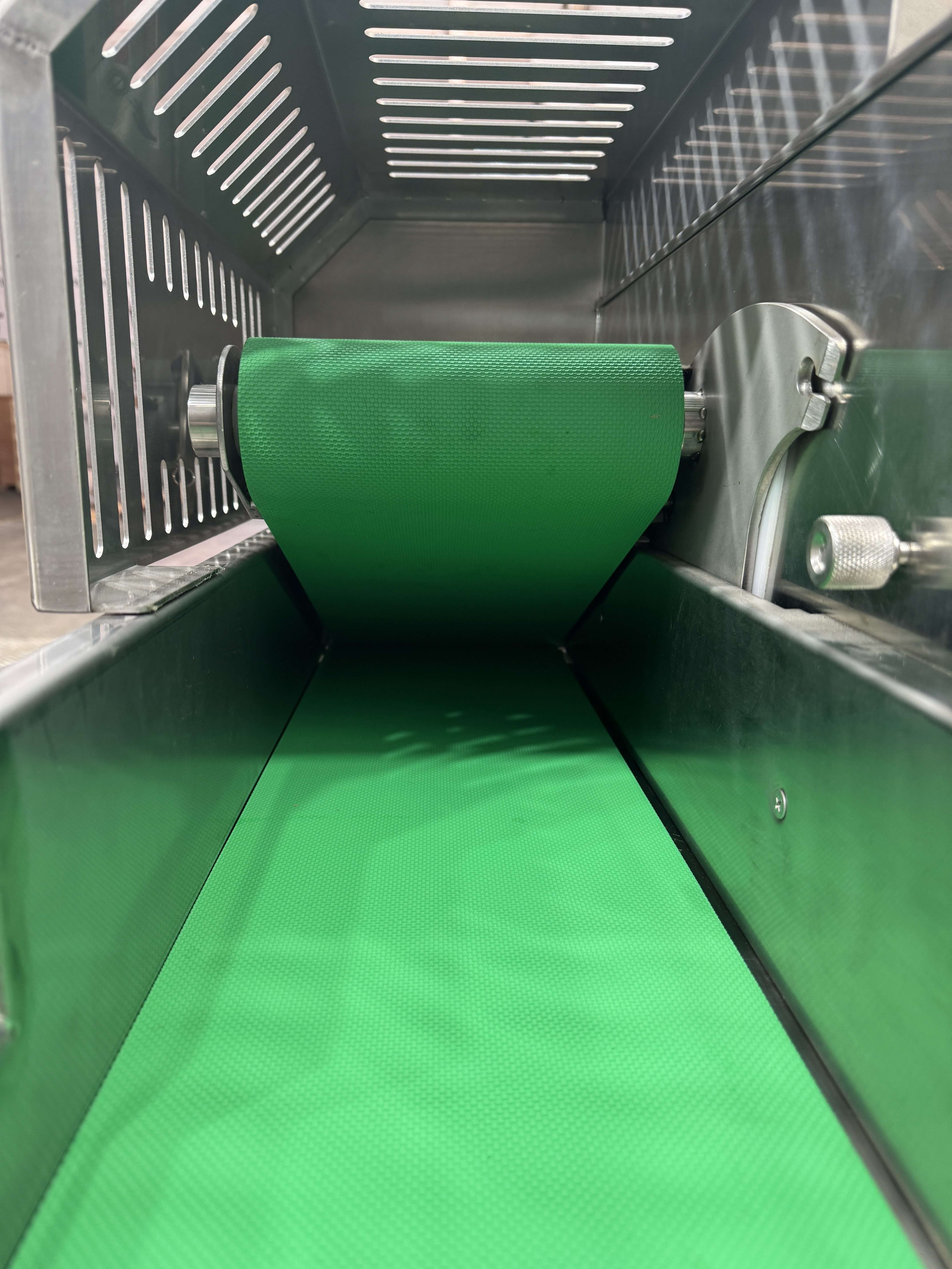 - Швидкознімна конструкція транспортерної стрічки суттєво спрощує щоденне санітарне обслуговування та миття внутрішніх вузлів машини.