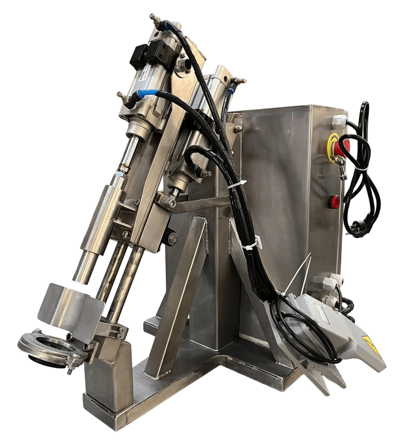 Машина для обвалки курячих ніжок STvega Chicken Leg Deboner — це компактне та ефективне рішення для напіввавтоматичного видалення кісток з курячих ніжок (гомілки, стегна) та плечової частини крила. Завдяки використанню пневматичного приводу, машина забезпечує дбайливе відділення м’яса від кістки, зберігаючи цілісність м’язових волокон та товарний вигляд продукції.
