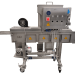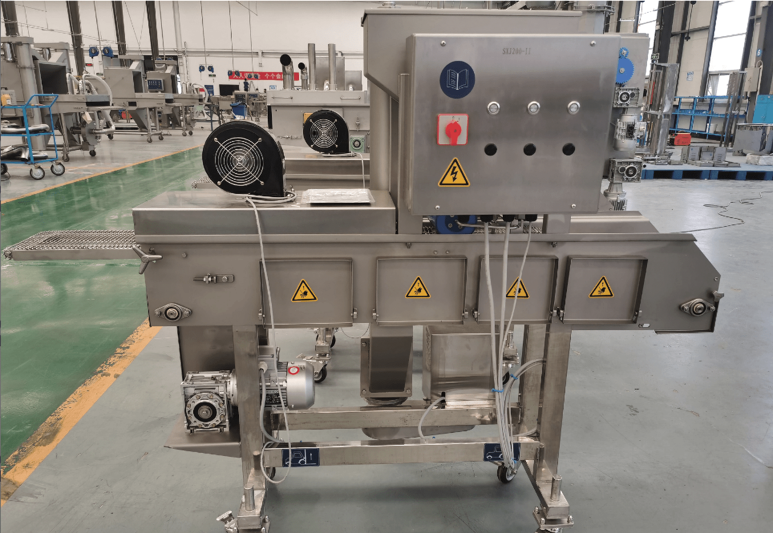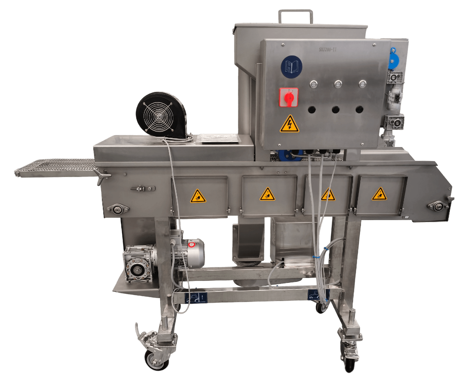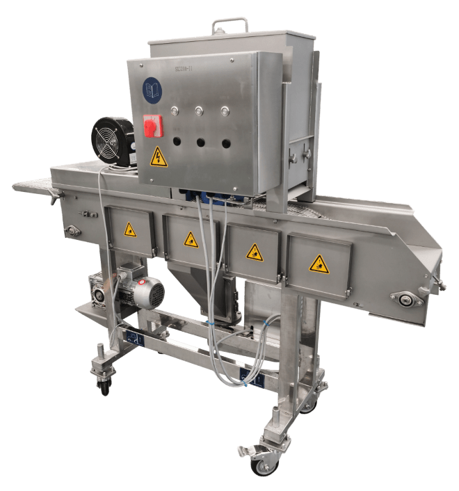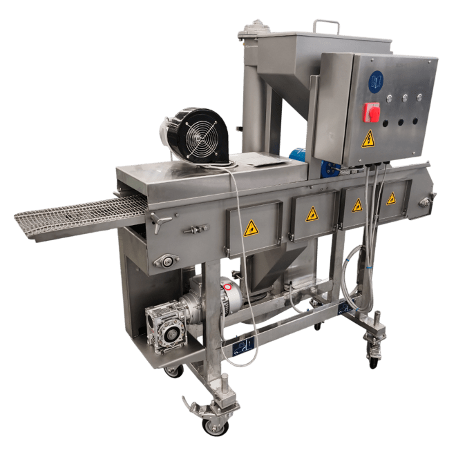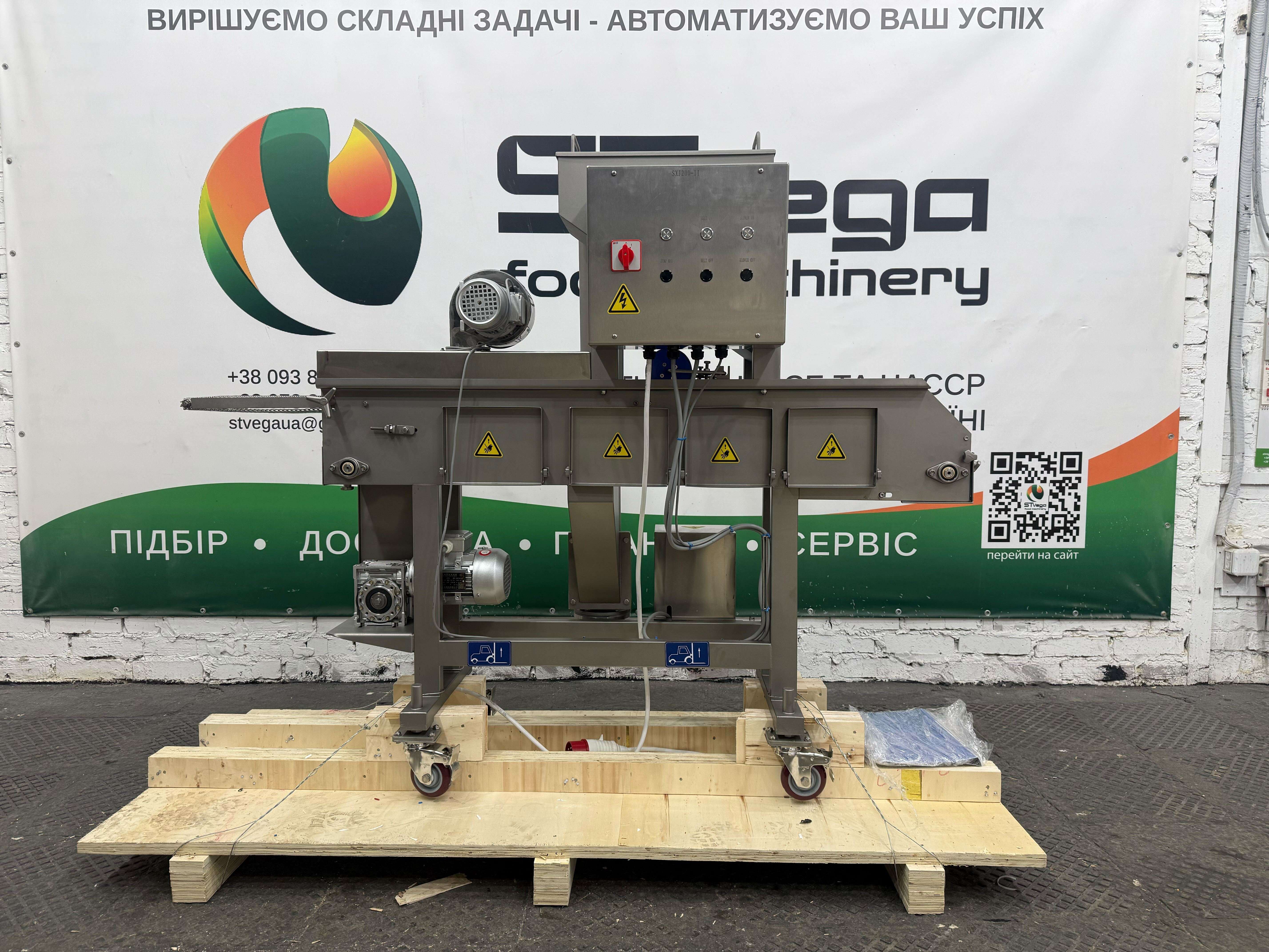 Машина може працювати як окрема одиниця або інтегруватися в технологічну лінію разом із формувальними, змочувальними або смажильними модулями. Підходить для виробництва котлет, нагетсів, шніцелів та інших продуктів у паніровці.