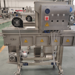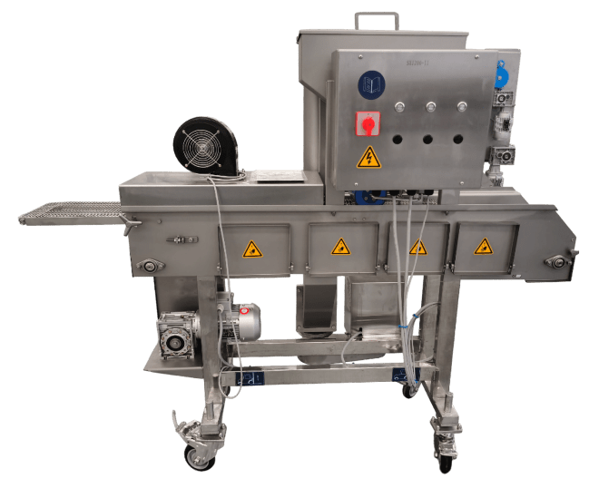 - Повітряний обдув на виході видаляє надлишки паніровки та формує охайний зовнішній вигляд виробів.