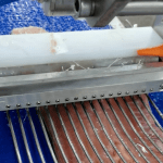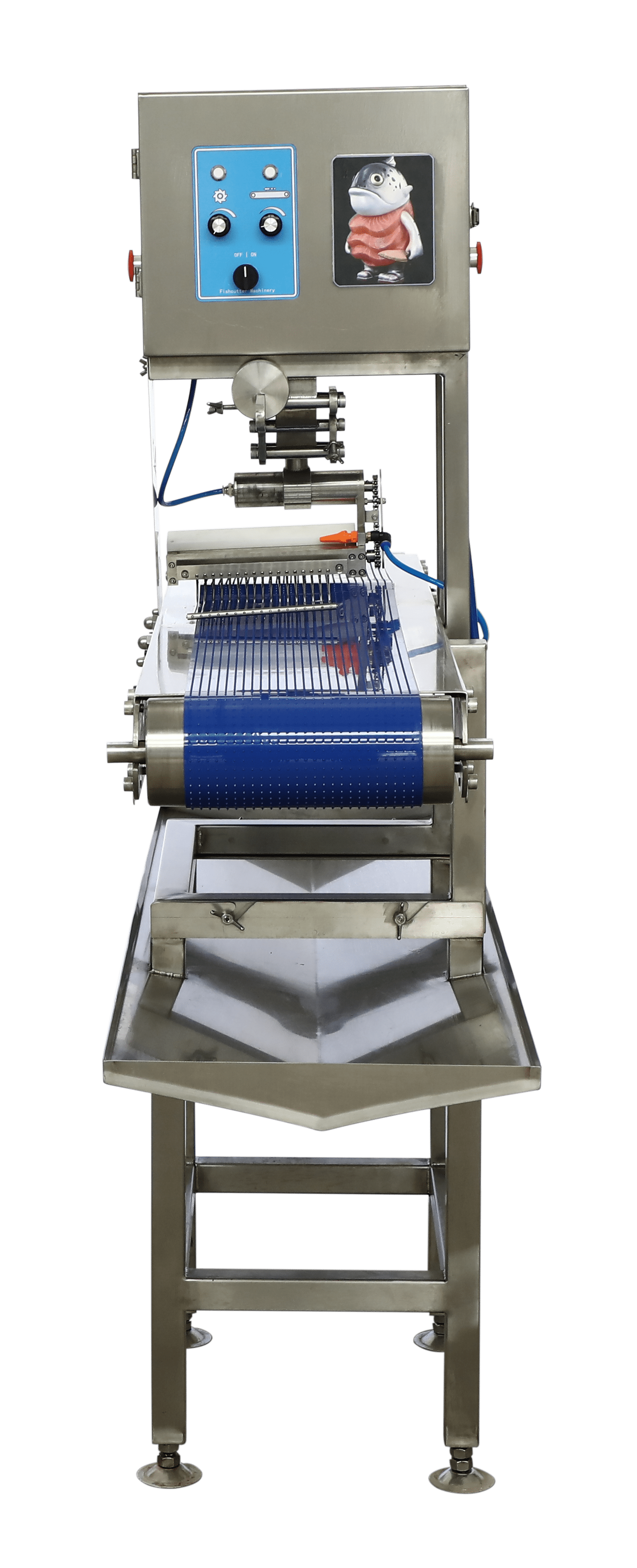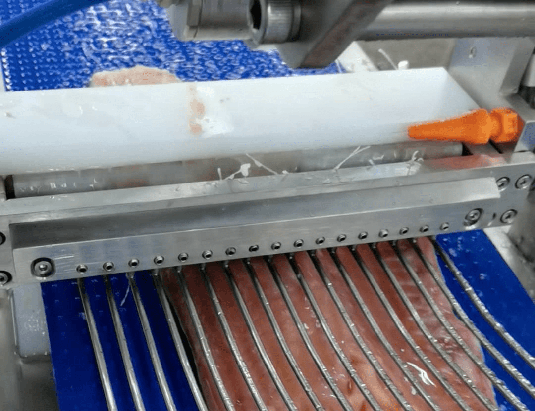 • Конвеєрна стрічка з шипованим профілем стабілізує положення філе в процесі обробки, що необхідно для якісного вилучення кожної кістки.