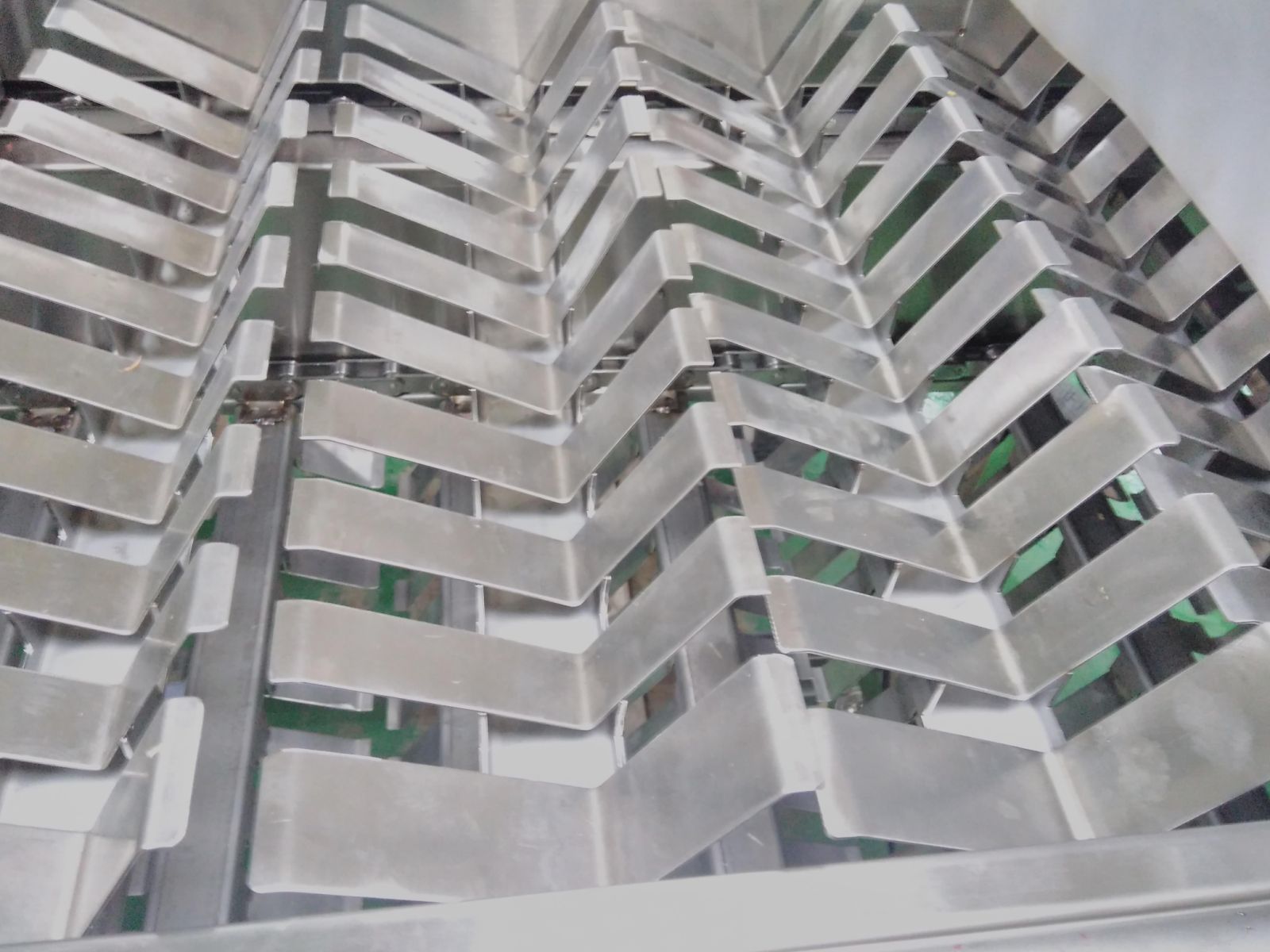 - Транспортерна стрічка з металевими тримачамиV-подібної форми забезпечує стабільну подачу продукту та його точне позиціонування.