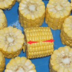 Після запуску машини оператор укладає кукурудзу поштучно на транспортерну стрічку, обладнану V-подібними металевими тримачами, рівномірно розміщеними по всій її довжині. Форма тримачів забезпечує правильне положення продукту під час транспортування. Далі транспортер подає продукт до ріжучого блоку з дисковими ножами, де відбувається нарізання на частини згідно з заданою товщиною. Розмір нарізки визначається відстанню між дисковими ножами, яку можна налаштувати відповідно до технологічних вимог. Після нарізання продукт спрямовується в приймальну ємність або передається на наступну ділянку автоматизованої лінії.