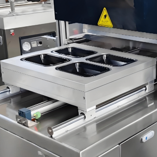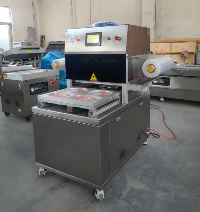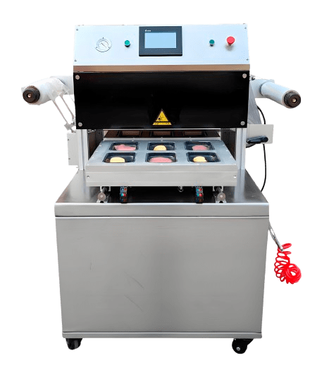 Оператор встановлює лотки з продукцією у формувальну матрицю, після чого за допомогою сенсорної панелі налаштовує параметри циклу та запускає процес. Лотки автоматично переміщуються всередину вакуумної камери, де вбудований насос відкачує повітря. Завдяки створеному вакууму лоток із продуктом щільно обтягується плівкою, тим самим формується герметична упаковка з привабливим виглядом. Після завершення циклу лотки виводяться назовні, і оператор дістає герметично запакований продукт.